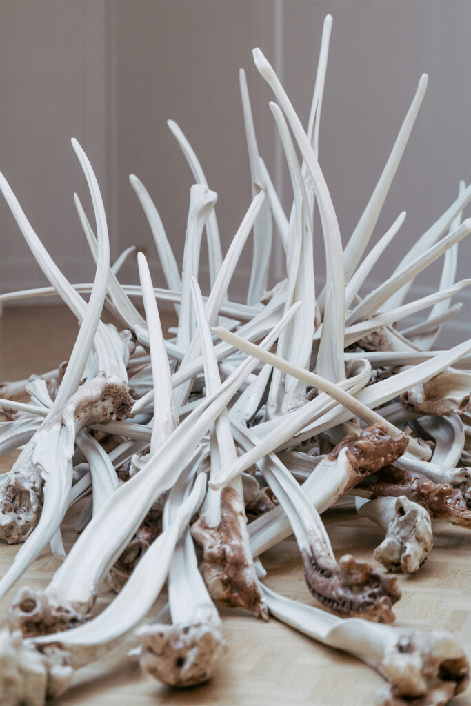 Wat begint als een directe verwijzing naar tanden, evolueert tijdens het maakproces naar vormen die meer aan beenderen doen denken. Het porselein — een edel materiaal — wordt op ongebruikelijk ruwe, bijna archaïsche wijze bewerkt, zonder dat dit afbreuk doet aan zijn inherente waardigheid. De objecten verliezen hun herkenbare vorm en manifesteren zich als relieken — opgestapeld tot een stille berg, als een ritueel, als een zwijgende evocatie van een mogelijk offer.